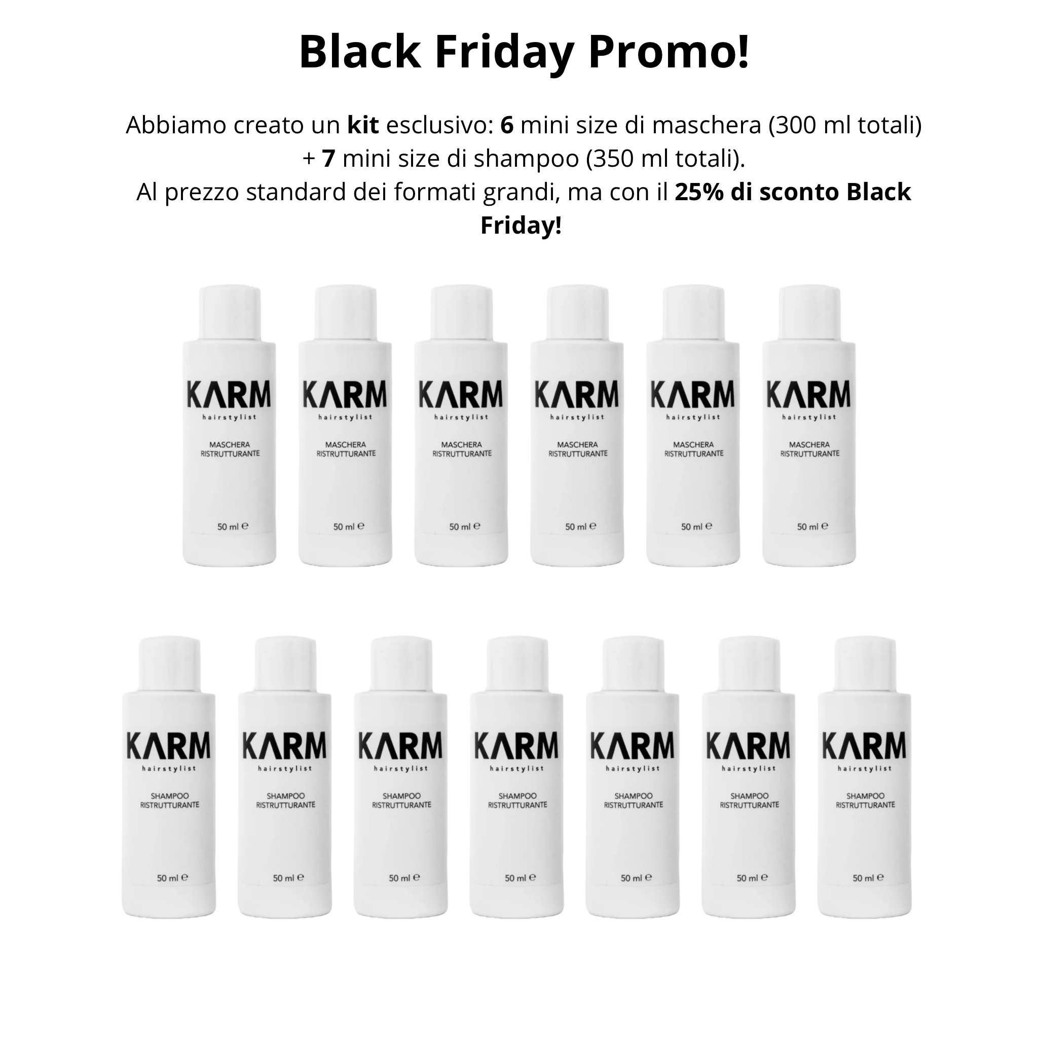 Abbiamo creato un kit esclusivo: 6 mini size di maschera (300 ml totali) + 7 mini size di shampoo (350 ml totali). Al prezzo standard dei formati grandi, ma con il 25% di sconto Black Friday!