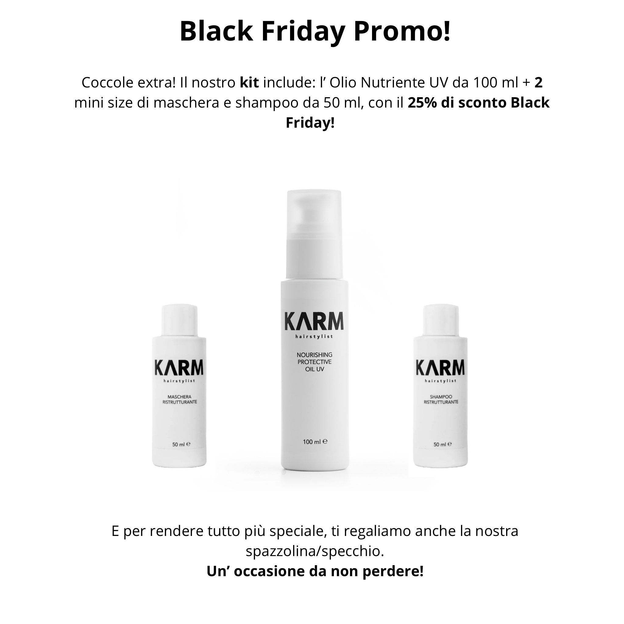 Coccole extra! Il nostro kit include: l’ Olio Nutriente UV da 100 ml + 2 mini size di maschera e shampoo da 50 ml, con il 25% di sconto Black Friday!